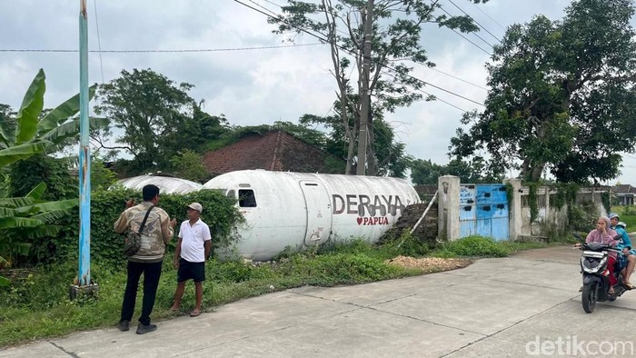 Kemudian di bagian dinding luar badan pesawat, terdapat tulisan ‘Deraya love Papua’. Di sebelah badan pesawat, terdapat bagian ekor pesawat. Sementara di sisi kiri tergeletak tumpukan sayap, kerangka mesin, dan roda pesawat.